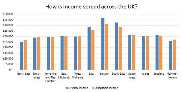 This graph shows how the average household income differs according to each region, with geographical divides clear. For instance, consider the difference between the North West and South East; North West has had a -£3 billion reduction in real term public spending whilst having an average household income of under £30,000 whereas the South East have had a £2 billion increase in real term spending whilst having an average household income of around £40,000.