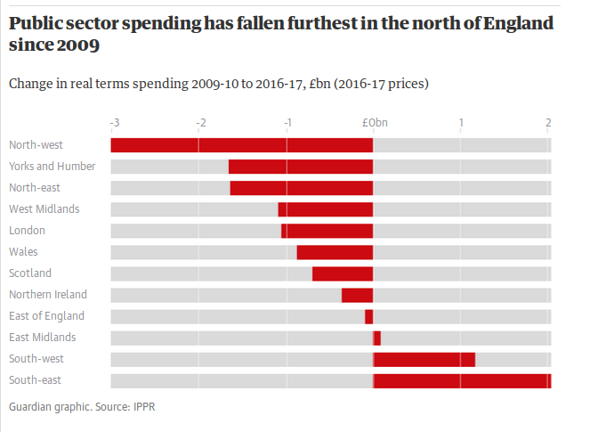 The thinktank IPPR North have found “government spending in the north of England has fallen by £6.3bn while the south-east and south-west of England have seen an increase of £3.2bn since 2009-10.”