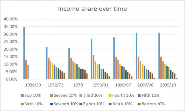 This involves a move towards privatisation, the promotion of the free market, attack of labour rights and working conditions associated with a focus on supply side economics. Consider the closure of Consett’s steel works, with 3,700 jobs lost in the North East – an area with the lowest average household wealth as shown in the graph above – under Margaret Thatcher as an example of destroying labour power, symbolically and physically. Importantly, “the top fifth continue to dominate the income spectrum, taking almost half the income before and after the crisis.”